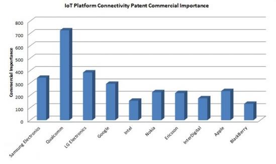 要评估前十大创新者的专利在商业上重要性(包含潜在的商业实施可能性、授权可能性),可以利用 Amber Cluster Search 的结果。将所有与 IOT 平台链接相关的专利权人键入搜索来评估商业价值,可以发现具有高商业价值的专利拥有人最高为高通、接着是 LG 电子、三星电子、Google、Apple、Nokia、Ericsson、InterDigital、Intel 和 BlackBerry。