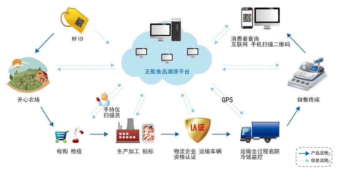 RFID技术贯穿于食品安全,包括生产、加工、流通、消费各环节,全过程严格控制,建立了一个完整的视频产业链安全控制体系,形成各类食品生产销售的闭环生产,以保证向社会提供优质的放心食品,并可确保供应链的高质量数据交流,让食品行业彻底实施食品的源头追踪以及在食品供应链中提供完全透明度的能力。