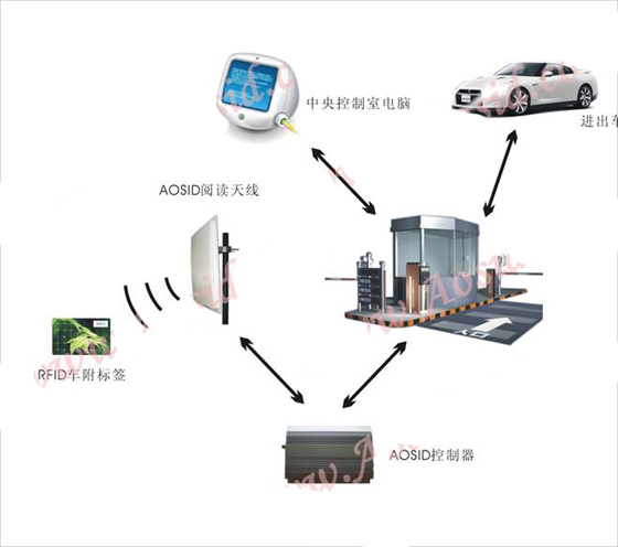 由于附在车体上的电子标签、车库出口和入口的收发天线、AOSID标签阅读器、由AOSID阅读器控制启动摄像机、AOSID后台管理平台以及内部通信网络等构成。