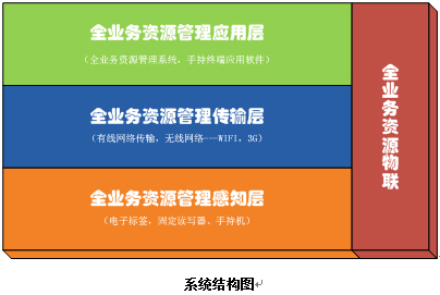 全业务资源管理应用层:由手持应用系统和全业务资源管理平台构成;手持终端实现现场巡检时的数据识别和数据录入等,全业务资源管理平台实现全业务资源的综合管理,业务资源初始化、业务资源实时监测输出,报警管理。