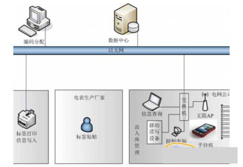 主管部分凭据贩卖需求分派指定电表序列号码。电表序列号码由主管部分分派给电子标签提供商。提供商凭据编码举行标签打印和信息写入。打印好的电子标签由电表生产厂家在生产线举行粘贴。粘贴好电子标签的电表配送给相应的供电局堆栈。由此就进入了电网公司的RFID仓储办理信息体系。对必要收支库的电表可以通过RFID移动手持终端举行收支库数据收罗。