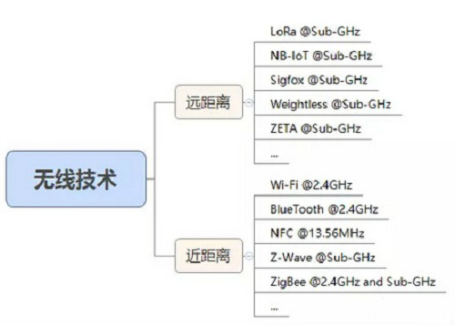 如按照传输距离远近来划分无线技术,可将常见的一些物联网无线技术分为如下: