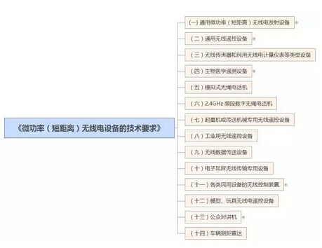 工信部2005年重新修订发布了《微功率(短距离)无线电设备的技术要求》信部无[2005]423 号文件。《要求》划分了14类设备:
