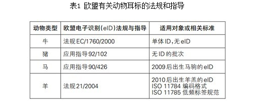 近年来,欧盟陆续发布了若干有关动物耳标的法规和应用指导,见表1。但这些文件主要关注低频标签(LF)的应用。虽然低频标签具有抗水性好的特性,但同时也有几个显著缺点,如成本高于超高频(UHF)标签,也不如后者的识读距离远(对于野外大规模放牧尤为影响),多标签冲突环境下识读率低等。