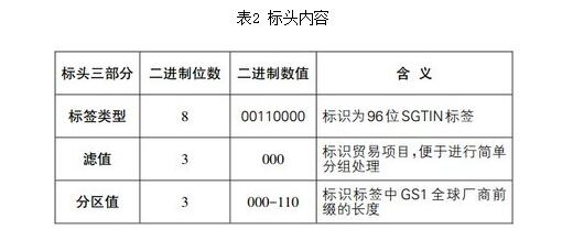 标头在确定标识类别的同时,也确定了标签数据位长度,本应用中使用96位二进制编码。虽然为了给用户提供更强大的序列号级编码能力,GS1 EPC标准也定义了198位二进制长度的SGTIN,可以支持最多20个数字字符的编码,但目前的欧盟耳标项目并未应用。
