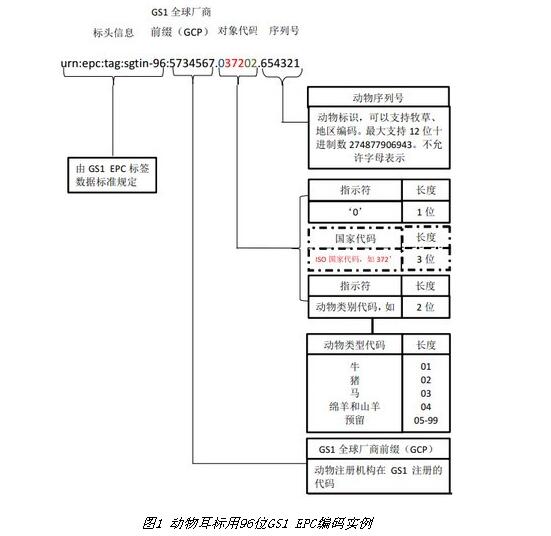 项目实施方对GS1 EPC标签标准和应用规范必须进行研究和理解,特别是充分领会标头值等概念;项目的实施必须基于和遵守GS1 EPC标准;标签的选择上需使用UHF 860-960 MHz 96位C1Gen2被动式标签;应用GS1 EPC标签数据标准,即SGTIN(序列化全球贸易项目代码);动物注册机构获得并使用由GS1编码机构分配的GS1全球厂商前缀;使用不超过7位的GS1全球厂商前缀(包括国家前缀);在GS1编码机构配合下,动物注册机构为每个动物分配序列号。