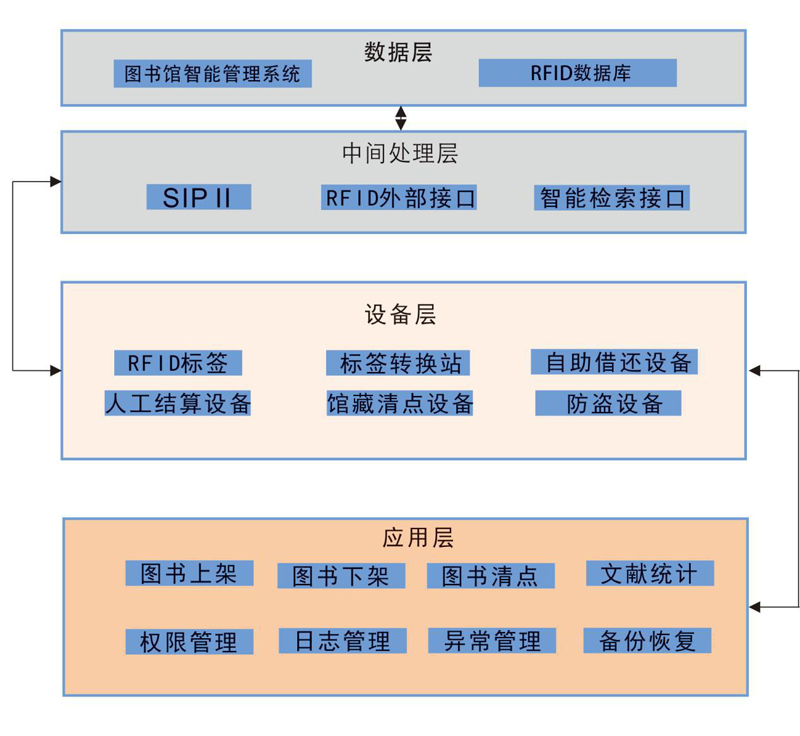 在系统架构上,我们提出了完整的RFID系统层次,包括RFID设备层、中间件和管理应用层。其中,RFID设备层是RFID信息采集实现的层次,图书电子标签的读写操作在这一层完成;中间件是RFID系统和其他管理系统联系的纽带,中间件屏蔽了应用层软件接口、数据等差异;管理应用层 则与具体的操作流程和业务相关。