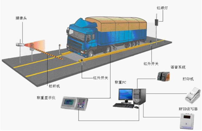 PC机综合控制自动道闸、感应线圈(或红外传感器)、摄像机(或数码相机)、动态汽车衡,实现闸