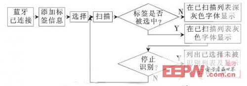 应用程序在实现物品RFID标签信息添加以及物品RFID标签清点扫描前,应首要打开蓝牙连接,搜索附近蓝牙设备,然后选择和便携RFID读写器建立连接。在进行添加操作时候,应用程序会向读写器发送单标签的扫描的命令,读写器返回标签的ID,用户输入物品名称之后,应用程序将其录入数据库中并且标注为未选中状态。在列出所有物品的界面中,用户可以对需要清点的物品进行选中或取消选中。当用户选中物品之后,物品的状态属性(THING_STATUS)值为“1”,表示物品将要被清点;否则为“0”,表示物品已在数据库中登记,但暂时是不需要清点。应用程序清点扫描物品的时候,向读写器发送防冲突识别(多标签识别)的命令,读写器不断返回带标签ID信息数据流。应用程序从数据流中提取出了标签ID,并且在数据库中查询其状态,若为“1”,在已扫描列表中以系统默认字体颜色(灰色)显示其物品名称;若为“0”,则以非系统默认字体颜色(深灰色)显示物品的名称。扫描个数是在扫描过程中实时显示已经被读写器扫描到的、并且进行登记过的标签个数。