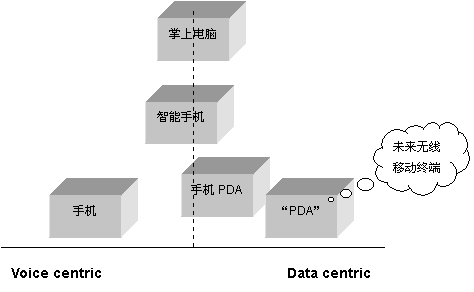 目前Data centric(PDA、Notebook)和Voice centric(Mobile phone)的融合已成为业界关注的热点之一。未来两种类型的产品究竟如何融合或集成?是替代式,还是逐步演进式?更多地强调物理外形的融合,还是功能上的集成?众说纷纭。但无论是怎样一种形式的融合,融合后的手持终端都将具有以下的特征: