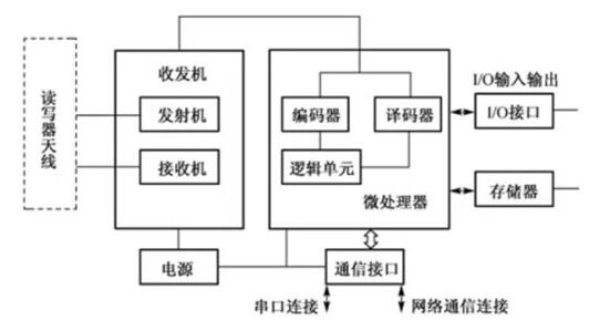 读写器硬件部分通常是由收发机、微处理器、存储器、外部传感器/执行器,报警器的输入/输出接口、通信接口以及电源等部件组成。