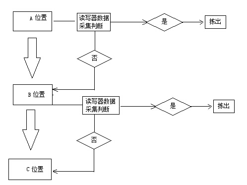 所以,采用了RFID技术可以很好的解决这些问题,对于整个分拣系统来说,我们在每一个流水线物品上贴放一张RFID电子标签,并在流水线上固定的位置布置好RFID读写器然后就能够采集到流通物料的信息,并且作出相应的处理,比如说是A、B、C,这三个字母可以代表三条流水线所需物料,如果周转箱经过A线,扫描条码,如果是A线物料就停在A流水线,并报警示灯,如果不是就继续走,到B线扫描,如果是B线就停在B线 ,并报警示灯, 不是就往下走 。
