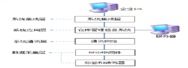 基于 RFID 的仓库管理系统的体系结构可分为四层。数据采集层、系统通讯层、系统应用层、系统集成层。数据采集层主要是通过 RFID 的中间件管理一个或多个射频识别设备以及其他的自动识别设备,并对采集的货物标签信息、库位信息等信息进行过滤和处理。系统通讯层主要是指通过无线通信技术把搜集到的信息传送到仓库管理信息系统的数据库中,包括无线接入设备和相关的网络设备等。系统应用层主要是对搜集的信息进行处理和提供访问接口。系统集成层主要是将仓库管理系统与企业原有的 EIS 系统进行连接,实现企业仓储信息能够共享的功能。