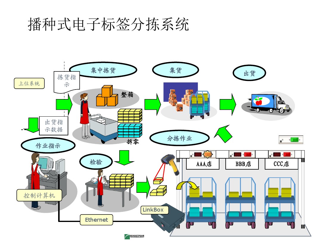 第二种与第一种不同,称之为播种式拣货系统。在这个系统中,每个电子标签将代表终端对象,例如订单厂商或配送对象等,员工收到多家订单后,将同种类货品进行汇总统计,当此类商品的LED灯闪烁时,无人叉车讲取出该类品所需的所有数量商品,再进行分配。这个方式主要应用在配送对象相对固定,但配送物品种类繁多且相似性大的企业需求中。在这类企业中,由于管理需要,经常移动商品的储位,利用人工管理影响效率,并容易增加出错概率。
