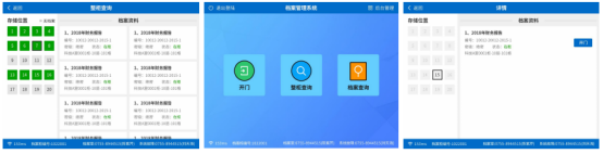 点击界面的整柜查询可显示该档案柜的所有档案信息及所在位置;点击界面的档案查询可查询到某份档案所在的柜-格-层-等具体位置,状态显示档案是否在柜;