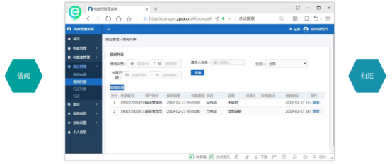 5、用户可根据名称或编号进行档案查询,在系统中添加借阅列表完成借阅申请;归还可选择在借阅台进行人工归还或在档案柜上进行自助归还两种方式;
