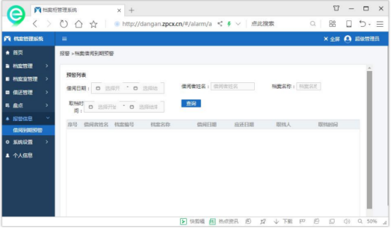 7、当有超期、逾期未归还的档案,管理系统会自动启动预警信息,进行归还提示;