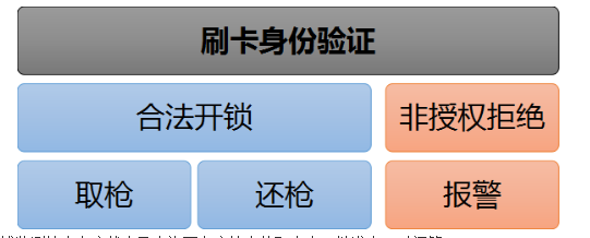 标签内存储的枪支代码信息可通过RFID读写设备自动获得,RFID读取点可以建立在枪支管理库的大门口。此外,操作人员需凭RFID操作员卡工作,在进行取枪或是还枪工作时,将出示操作卡,并与相应的枪支建立关联录入系统,以便于管理。在人员取用或归还枪支时,由库房门口安装的固定式读写器对枪支标签进行自动扫描并将枪支ID号、任务标号、任务执行时间与基本类型、实施状态等相关信息自动上传至系统中,系统根据任务单自动核对确认后,确定枪支的出库。任务结束后,操作员凭借领取枪支时的操作卡进行枪支归还,并与枪支领取时的系统信息进行自动匹配,匹配无误枪支方可入库,系统枪支信息将由领用状态改为待用状态。