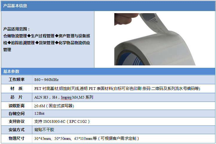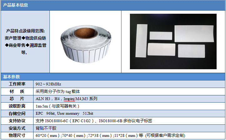 最常见的电子标签封装方式就是贴纸式封装,外封材料以铜版纸为主,一般由外层材料、芯片、天线电路层组成,还可以增加胶层,使其具有粘贴功能,满足不同的应用场景。铜版纸具有印刷功能,通过普通的RFID打印机可以满足文字打印的功能。一般这种标签成品可制成卷标的形式,价格低廉,是市场上应用最广泛的封装形式。可以用在航空行李管理、普通资产管理、服装吊牌、库房管理等领域。