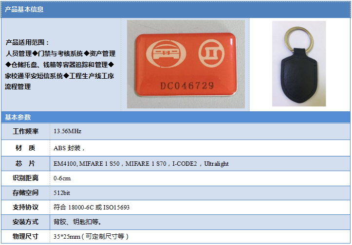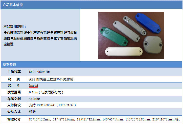 塑料封装的RFID标签形式也比较常见,这种封装方式的成本相对于铜版纸来讲比较高一些。通常采用特定的工艺,将芯片及天线与塑料基材(PVC/PET/ABS等)压制进行封装。其中PVC和PET封装形式与铜版纸基本一致,而ABS则采用注塑的形式,将内部INLAY完全封闭。塑料封装的电子标签一般具有耐撕、防水、防油、耐高温,防止特殊液体污染的特点。塑料标签可以做成各种外观形态,通常应用于资产管理、仓储物流、门禁管理等方面。