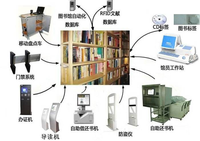 RFID图书管理系统主要包括以下内容:标签转换系统、自助借书系统、自助还书系统、智能查找系统、推车式盘点系统、安全门检测系统。