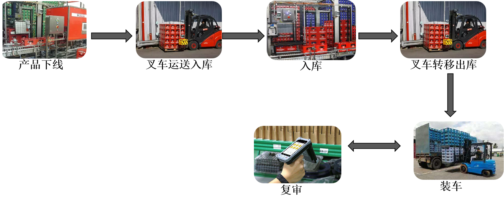产品下产线后,以托盘为单位进行装拣,使用叉车运到存储库房,托盘上贴有电子标签,标签内记录资产的品类、批号、有效期、数量等信息;