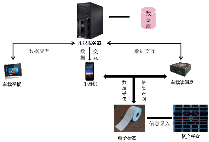 叉车上装有车载读写器以及车载平板,读写器用于读取托盘电子标签信息,平板电脑内安装移动管理系统,可与企业ERP进行对接,平板电脑全程实时记录资产放置的区域、时间、批号等信息;