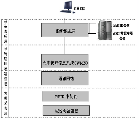 基于RFID技术的物资管理功能体系分为四层。第一层是数据采集层,采集数据流进行过滤和集成的预处理;第二层是通讯层,把采集来的数据传递到WMS数据库;第三层是系统应用层,用于实现对采集的数据进行管理、仓库管理信息系统和提供外部访问接口;第四层是系统集成层,将基于RFID的数字化仓库管理系统和企业原有信息系统互联,使企业内部信息更加透明化。