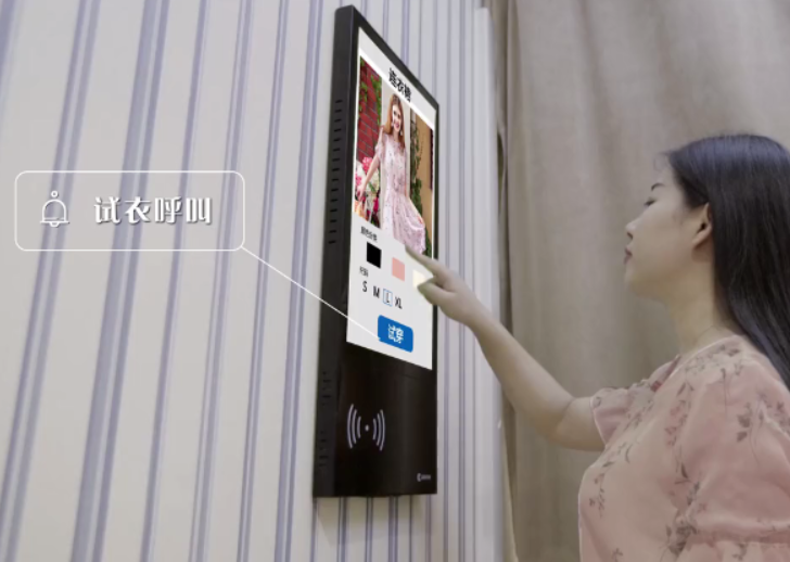 在无人零售的店铺中,还支持投放RFID智能试衣间,试衣间内布设RFID读取器,当带有标签的服饰进入到读取器范围内时,试衣间内镜子或显示屏会显示服装信息,甚至模特上身效果,搭配方案等。