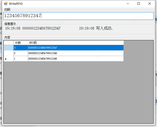 原始端,在表类生产企业增加一个贴RFID芯片的末端工序,我司为生产企业定制开发专用的扫码、写码自动软件。(如下图)用扫描枪扫描表上的条码通过软件系统自动生成条码 号并自动写入到贴在表上的RFID芯片中并记录数据保存。